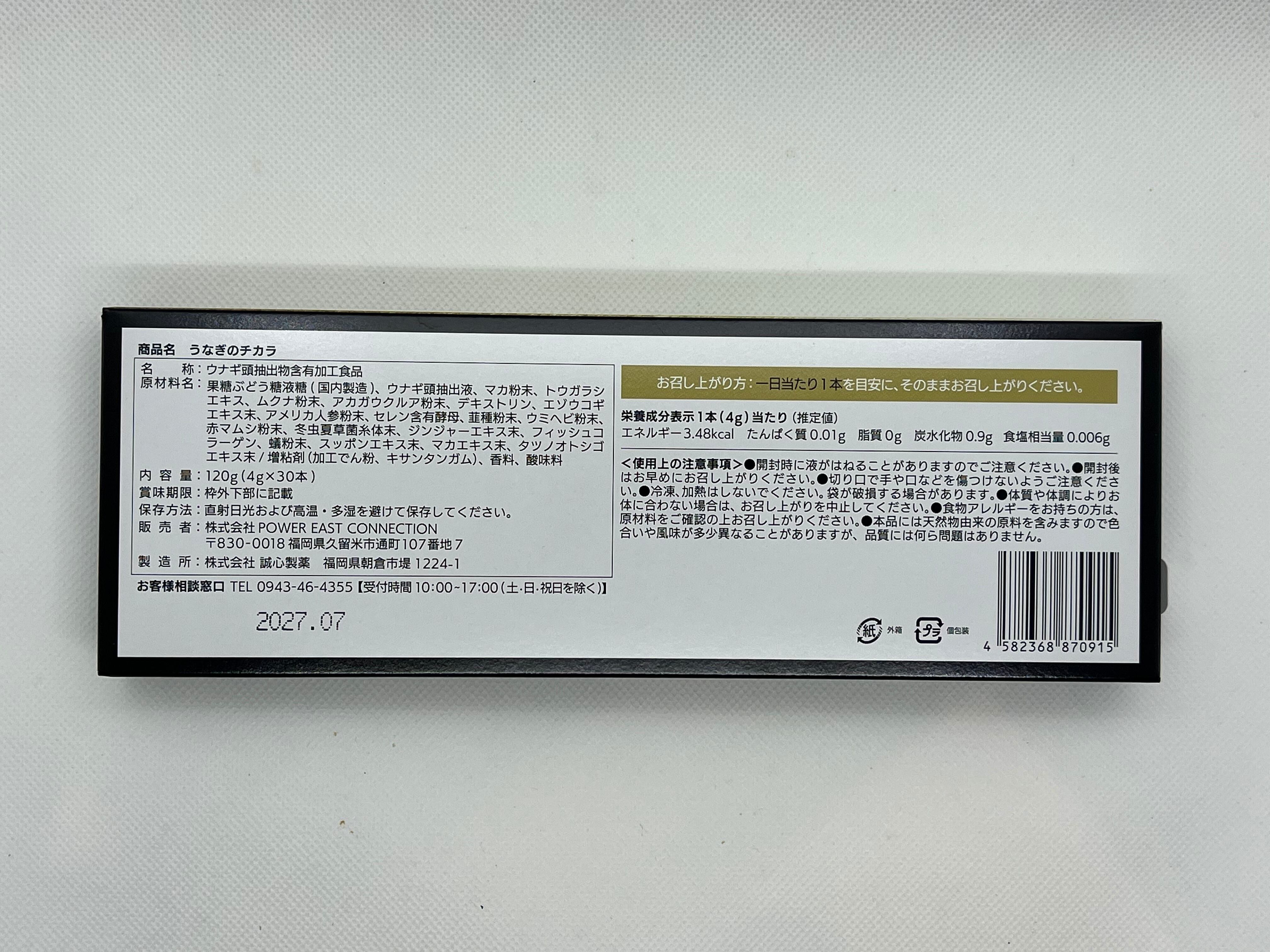 果糖ぶどう糖液糖(国内製造)、ウナギ頭抽出液、マカ粉末、トウガラシエキス、ムクナ粉末、アカガウクルア粉末、デキストリン、エゾウコギエキス末、アメリカ人参粉末、セレン含有酵母、韮種粉末、ウミヘビ粉末、赤マムシ粉末、冬虫夏草菌糸体末、ジンジャーエキス末、フィッシュコラーゲン粉末、スッポンエキス末、マカエキス末、タツノオトシゴエキス末/増粘剤(加工でん粉、キサンタンガム)、香料、酸味料