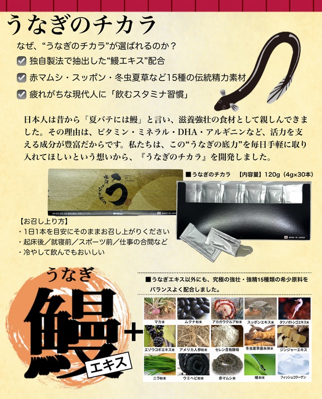独自製法で抽出したうなぎエキスに、究極の強壮15種類の世界の稀少原料をバランスよく配合しました。